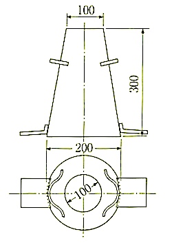 スランプコーンは、図1のように上端内径100mm、下端内径200mm、高さ300mm及び厚さ 5mm以上の金属製(1)とし、適切な位置に押さえと取っ手(2)を付ける。