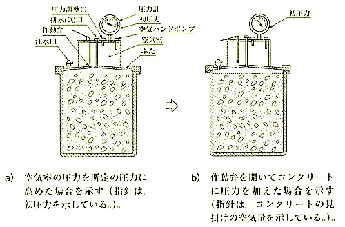 空気量の試験方法には、JIS A 1128(フレッシュコンクリートの空気量の圧力による試験方法ー空気室圧力方法)、JIS A 1118(フレッシュコンクリートの空気量の容積による試験方法(容積方法))及びJIS A 1116(フレッシュコンクリートの単位容積質量試験方法及び空気量の質量による試験方法(質量方法))の 3種類の方法がある。これらの内、最も多く使用されているのは、JIS A 1128である。この試験の実施においては、容器の上面とふたの下面の間の空間を水で満たす方法(注水法)と水を満たさない方法(無注水法)の 2種類の測定方法がある。測定精度としては注水法の方が優れているが、一般的には、測定終了後の試料の廃棄の問題から、多くの建設現場では、無注水法で空気量の試験が行われている。ただし、いずれの方法で実施する場合でも、空気が漏れないよう容器の上面とふたの下面を正しく一致させることが必要である。