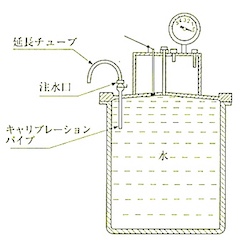 c) 作動弁を十分に開き、 空気室の気圧と容器内の圧力とを平衡させて圧力計を読み、その読みが空気量 0%の目盛と正しく一致するかどうかを調べる。これが一致しない場合には、空気及び水の漏れの有無、その他を点検した後、キャリブレーションを繰り返す。 2 〜 3 回繰り返したとき、圧力計の指針は同じ点を指すが,零点に一致しない場合には、初圧力の目盛の位置を、指針が零点にとどまるように移動する。 この後操作を繰り返し、初圧力の目盛の位置が適切であったかどうかを確かめる。