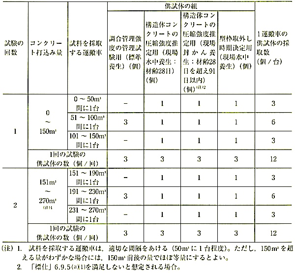 供試体の養生方法、試験の材齢、1 回の試験の供試体の個数及び試験の回数は、「標仕」表 6.9.2 による。ただし、寒中コンクリートの場合は「標仕」表 6.11.1による。