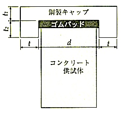 供試体の上面がゴムパッドに接するように鋼製キャップをかぶせる。 コンクリート供試体の側面と鋼製キャップの内側面とが接することのないよう、鋼製キャップの位置を調整する。