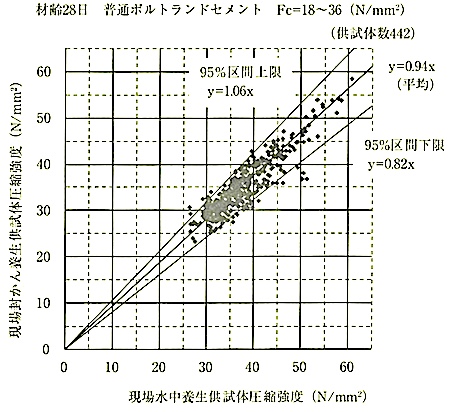 (3) 国土交通省大臣官房官庁営繕部では、官庁営繕工事を対象に、平成 23年 5月から平成 24年 9月に打ち込まれた構造体コンクリートの材齢 28日の現場水中養生供試体と現場封かん養生供試体の圧縮強度の関係について調査を行った。その結果、図6.9.2 に示すように、設計基準強度 18 ~ 36N/mm2 で普通ポルトランドセメントを使用したコンクリートの材齢 28日の現場封かん養生供試体の圧縮強度は、同じく材齢 28日の現場水中養生供試体の圧縮強度の 0.94倍( 平均値 )で、95%の信頼限界では 0.82倍に相当することが確認されている。