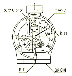 c) ゴム硬度計をゴムパッドに押し付け、5秒後の指針の値を読み取る。 このとき、押しつける力の目安は 8 ~10 N程度とするのがよい(1)。
